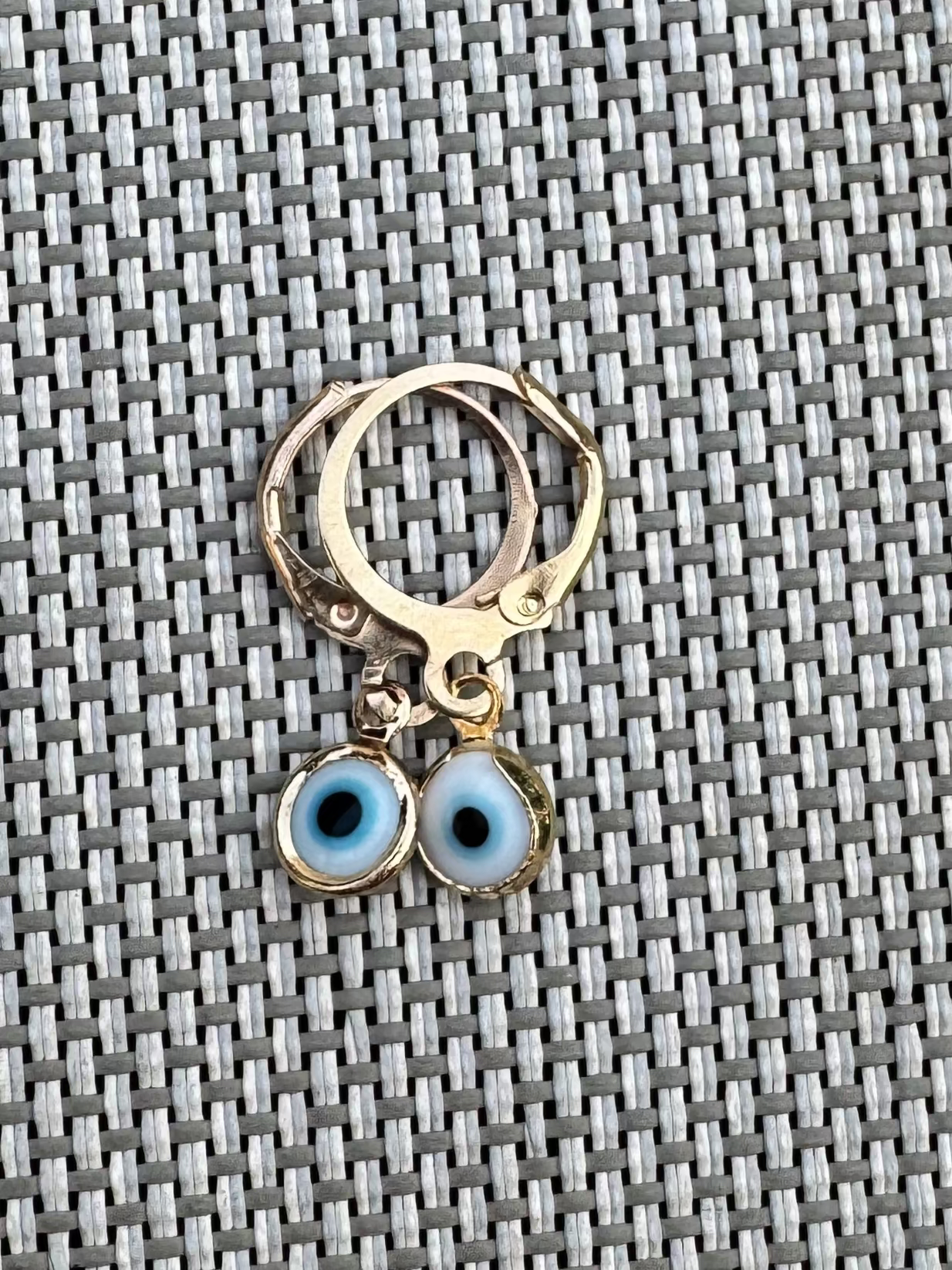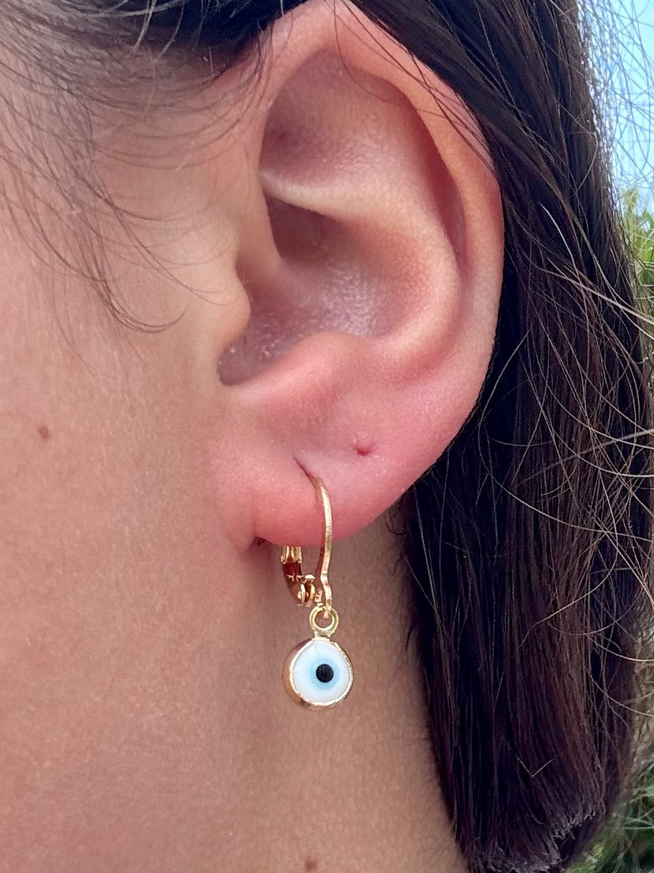 These gold huggies feature a soft-toned evil eye charm in white and light blue enamel—a modern twist on a classic symbol of protection. Non-allergenic and secured with a comfy click-closure, they’re made to be worn daily for both style and good vibes